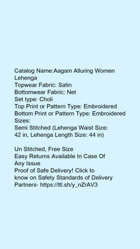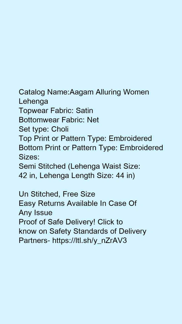 Catalog Name:*Aagam Alluring Women Lehenga* Topwear Fabric: Satin Bottomwear Fabric: Net Set type: Choli Top Print or Pattern Type: Embroidered Bottom Print or Pattern Type: Embroidered Sizes: Semi Stitched (Lehenga Waist Size: 42 in, Lehenga Length Size: 44 in) Un Stitched, Free Size Easy Returns Available In Case Of Any Issue *Proof of Safe Delivery! Click to know on Safety Standards of Delivery Partners- https://ltl.sh/y_nZrAV3