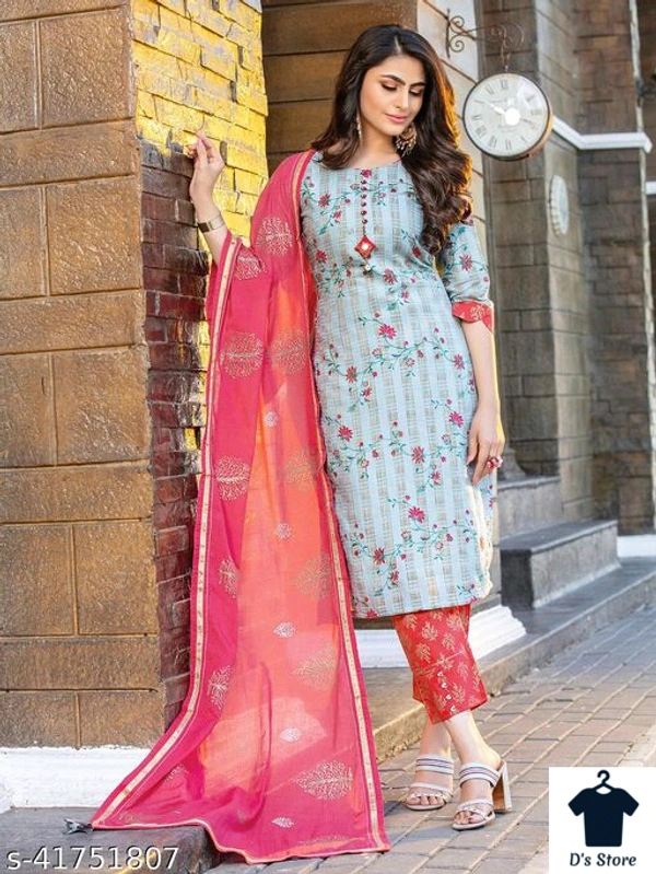 Cotton Candy Sky Blue Kurta Set Kurta Fabric: Cotton Bottomwear Fabric: Cotton Fabric: Chambray Sleeve Length: Three-Quarter Sleeves Set Type: Kurta With Dupatta And Bottomwear Bottom Type: Pants Pattern: Printed Multipack: Single Sizes: S (Bust Size: 36 in, Kurta Waist Size: 34 in, Kurta Length Size: 44 in, Bottom Length Size: 38 in) M (Bust Size: 38 in, Kurta Waist Size: 36 in, Kurta Length Size: 44 in, Bottom Length Size: 38 in) L (Bust Size: 40 in, Kurta Waist Size: 38 in, Kurta Length Size: 44 in, Bottom Length Size: 38 in) XL (Bust Size: 42 in, Kurta Waist Size: 40 in, Kurta Length Size: 44 in, Bottom Length Size: 38 in) XXL (Bust Size: 44 in, Kurta Waist Size: 42 in, Kurta Length Size: 44 in, Bottom Length Size: 38 in) Cotton Candy Sky Blue Printed Cotton Kurti with Dupatta and Pant Set Country of Origin: India