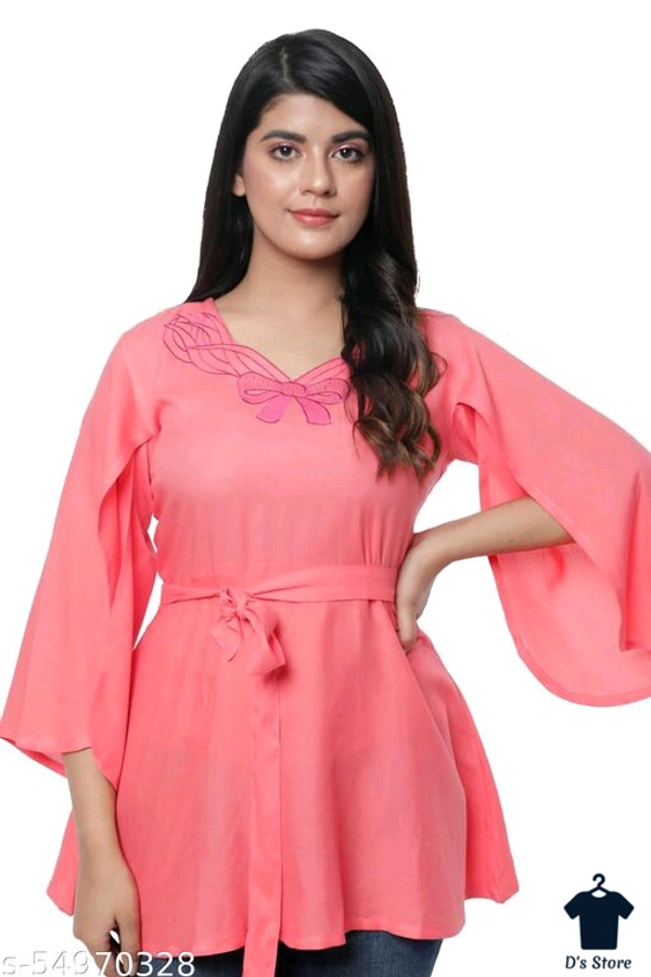 Catalog Name:*Trendy Latest Women Tops & Tunics* Fabric: Rayon Sleeve Length: Three-Quarter Sleeves Pattern: Embroidered Multipack: 1 Sizes: XS (Bust Size: 34 in) S (Bust Size: 36 in) M (Bust Size: 38 in) L (Bust Size: 40 in) XL (Bust Size: 42 in) XXL (Bust Size: 44 in) Easy Returns Available In Case Of Any Issue *Proof of Safe Delivery! Click to know on Safety Standards of Delivery Partners- https://ltl.sh/y_nZrAV3