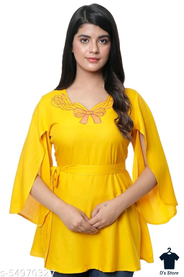 Catalog Name:*Trendy Latest Women Tops & Tunics* Fabric: Rayon Sleeve Length: Three-Quarter Sleeves Pattern: Embroidered Multipack: 1 Sizes: XS (Bust Size: 34 in) S (Bust Size: 36 in) M (Bust Size: 38 in) L (Bust Size: 40 in) XL (Bust Size: 42 in) XXL (Bust Size: 44 in) Easy Returns Available In Case Of Any Issue *Proof of Safe Delivery! Click to know on Safety Standards of Delivery Partners- https://ltl.sh/y_nZrAV3