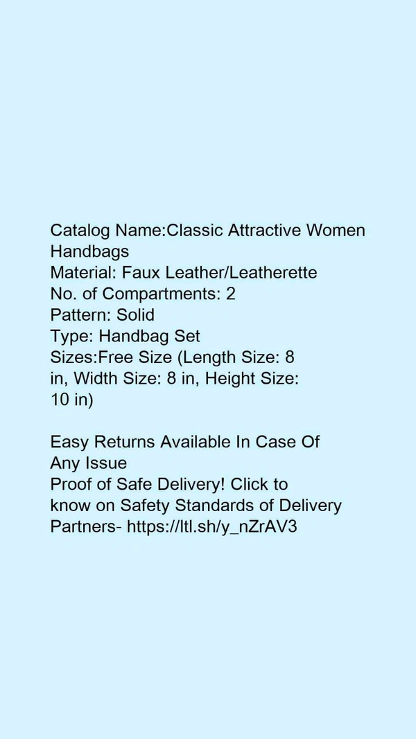 Catalog Name:*Classic Attractive Women Handbags* Material: Faux Leather/Leatherette No. of Compartments: 2 Pattern: Solid Type: Handbag Set Sizes:Free Size (Length Size: 8 in, Width Size: 8 in, Height Size: 10 in) Easy Returns Available In Case Of Any Issue *Proof of Safe Delivery! Click to know on Safety Standards of Delivery Partners- https://ltl.sh/y_nZrAV3