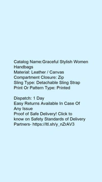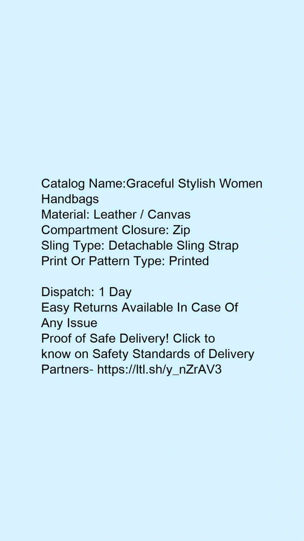 Catalog Name:*Graceful Stylish Women Handbags* Material: Leather / Canvas Compartment Closure: Zip Sling Type: Detachable Sling Strap Print Or Pattern Type: Printed Dispatch: 1 Day Easy Returns Available In Case Of Any Issue *Proof of Safe Delivery! Click to know on Safety Standards of Delivery Partners- https://ltl.sh/y_nZrAV3
