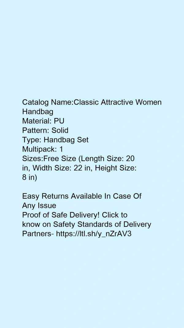 Catalog Name:*Classic Attractive Women Handbag* Material: PU Pattern: Solid Type: Handbag Set Multipack: 1 Sizes:Free Size (Length Size: 20 in, Width Size: 22 in, Height Size: 8 in) Easy Returns Available In Case Of Any Issue *Proof of Safe Delivery! Click to know on Safety Standards of Delivery Partners- https://ltl.sh/y_nZrAV3
