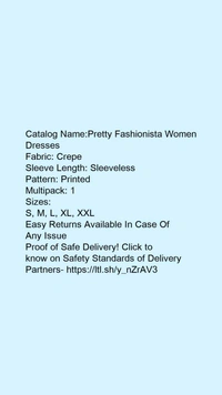 Catalog Name:*Pretty Fashionista Women Dresses* Fabric: Crepe Sleeve Length: Sleeveless Pattern: Printed Multipack: 1 Sizes: S, M, L, XL, XXL Easy Returns Available In Case Of Any Issue *Proof of Safe Delivery! Click to know on Safety Standards of Delivery Partners- https://ltl.sh/y_nZrAV3