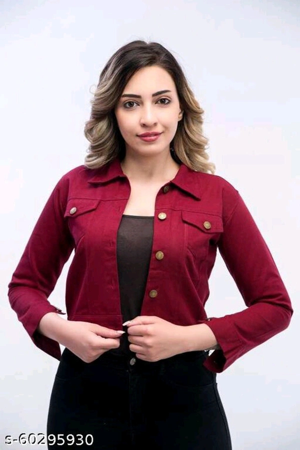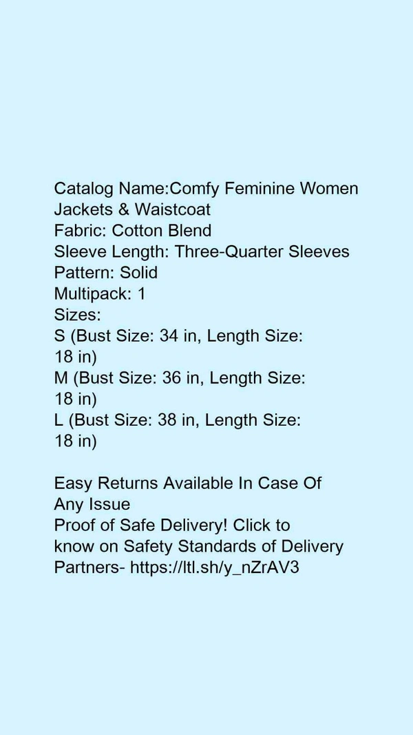 Yellow Denim Jacket With Good Quality Fabric: Cotton Blend Sleeve Length: Three-Quarter Sleeves Pattern: Solid Multipack: 1 Sizes: S (Bust Size: 34 in, Length Size: 18 in) XL (Bust Size: 40 in, Length Size: 18 in) L (Bust Size: 38 in, Length Size: 18 in) M (Bust Size: 36 in, Length Size: 18 in) Women's fashion is changing every day but Jacket are something that will be always in trend no matter what and they can be worn at any occasion be it casual or formal. Look desirable and feel fabulous in these pull-on women Jacket which creates a terrific fit and all-day comfort. The pockets are perfect for carrying any necessities.