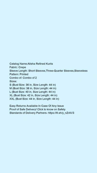 Catalog Name:*Alisha Refined Kurtis* Fabric: Crepe Sleeve Length: Short Sleeves,Three-Quarter Sleeves,Sleeveless Pattern: Printed Combo of: Combo of 2 Sizes: S (Bust Size: 36 in, Size Length: 44 in) M (Bust Size: 38 in, Size Length: 44 in) L (Bust Size: 40 in, Size Length: 44 in) XL (Bust Size: 42 in, Size Length: 44 in) XXL (Bust Size: 44 in, Size Length: 44 in) Easy Returns Available In Case Of Any Issue *Proof of Safe Delivery! Click to know on Safety Standards of Delivery Partners- https://ltl.sh/y_nZrAV3