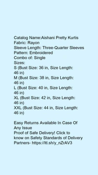 RATAN FABTEX EMBRIODERY FLAYRED KURTA Fabric: Rayon Sleeve Length: Three-Quarter Sleeves Pattern: Embroidered Combo of: Single Sizes: S (Bust Size: 36 in, Size Length: 46 in) XL (Bust Size: 42 in, Size Length: 46 in) L (Bust Size: 40 in, Size Length: 46 in) M (Bust Size: 38 in, Size Length: 46 in) XXL (Bust Size: 44 in, Size Length: 46 in) This Beautiful Combination Of Kurta With Eye Relieving Light Colours Is Perfect Wear For Women From The Brand RATAN FABTEX. This Fabric Offers Lightweight Feel And Superior Comfort.This Kurta Is Comfortable To Wear All Day Long.This Set Is A Stylish Option For A Nice Family Function Or An Event When Teamed With Matching Jewellery And Classic Flats. Country of Origin: India
