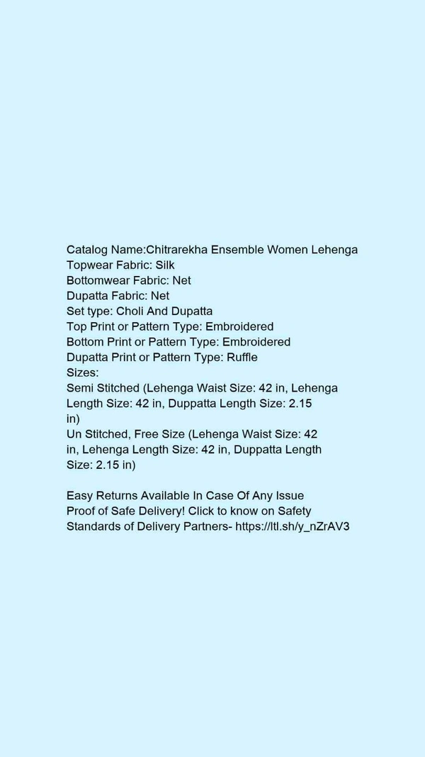 Alisha Sensational Women Lehenga Topwear Fabric: Silk Bottomwear Fabric: Net Dupatta Fabric: Net Set type: Choli And Dupatta Top Print or Pattern Type: Embroidered Bottom Print or Pattern Type: Embroidered Dupatta Print or Pattern Type: Ruffle Sizes: Free Size (Lehenga Waist Size: 42 in, Lehenga Length Size: 42 in, Duppatta Length Size: 2.15 m) Semi Stitched (Lehenga Waist Size: 42 in, Lehenga Length Size: 42 in, Duppatta Length Size: 2.15 m) Country of Origin: India