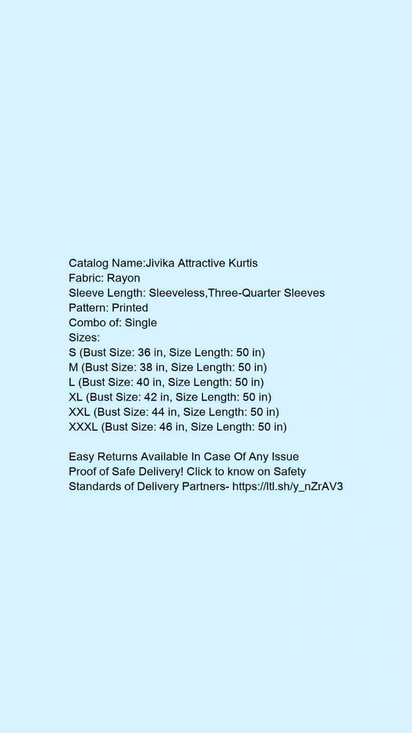 Catalog Name:*Jivika Attractive Kurtis* Fabric: Rayon Sleeve Length: Sleeveless,Three-Quarter Sleeves Pattern: Printed Combo of: Single Sizes: S (Bust Size: 36 in, Size Length: 50 in) M (Bust Size: 38 in, Size Length: 50 in) L (Bust Size: 40 in, Size Length: 50 in) XL (Bust Size: 42 in, Size Length: 50 in) XXL (Bust Size: 44 in, Size Length: 50 in) XXXL (Bust Size: 46 in, Size Length: 50 in) Easy Returns Available In Case Of Any Issue *Proof of Safe Delivery! Click to know on Safety Standards of Delivery Partners- https://ltl.sh/y_nZrAV3
