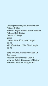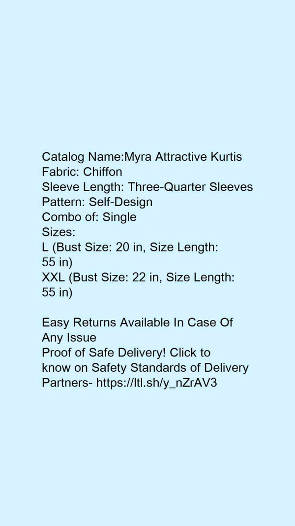 Abhisarika Petite Kurtis Fabric: Chiffon Sleeve Length: Three-Quarter Sleeves Pattern: Self-Design Combo of: Single Sizes: XL (Bust Size: 21 in, Size Length: 55 in) L (Bust Size: 20 in, Size Length: 55 in) M (Bust Size: 19 in, Size Length: 55 in) XXL (Bust Size: 22 in, Size Length: 55 in) Country of Origin: India