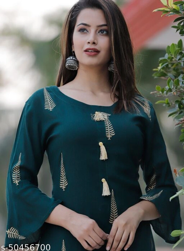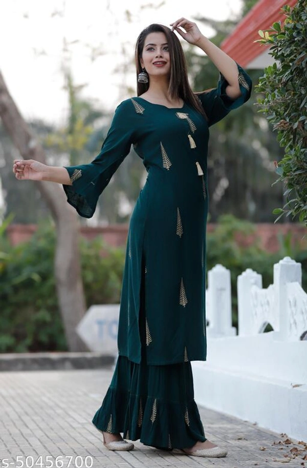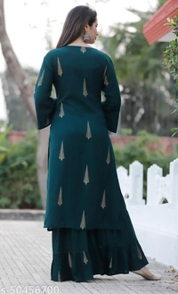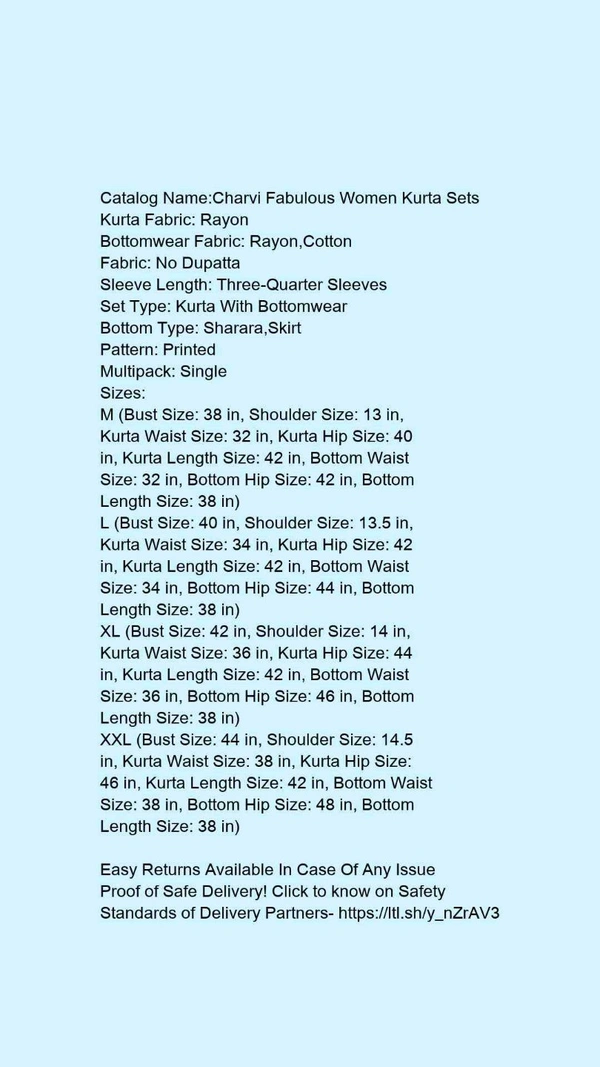 Catalog Name:*Charvi Fabulous Women Kurta Sets* Kurta Fabric: Rayon Bottomwear Fabric: Rayon,Cotton Fabric: No Dupatta Sleeve Length: Three-Quarter Sleeves Set Type: Kurta With Bottomwear Bottom Type: Sharara,Skirt Pattern: Printed Multipack: Single Sizes: M (Bust Size: 38 in, Shoulder Size: 13 in, Kurta Waist Size: 32 in, Kurta Hip Size: 40 in, Kurta Length Size: 42 in, Bottom Waist Size: 32 in, Bottom Hip Size: 42 in, Bottom Length Size: 38 in) L (Bust Size: 40 in, Shoulder Size: 13.5 in, Kurta Waist Size: 34 in, Kurta Hip Size: 42 in, Kurta Length Size: 42 in, Bottom Waist Size: 34 in, Bottom Hip Size: 44 in, Bottom Length Size: 38 in) XL (Bust Size: 42 in, Shoulder Size: 14 in, Kurta Waist Size: 36 in, Kurta Hip Size: 44 in, Kurta Length Size: 42 in, Bottom Waist Size: 36 in, Bottom Hip Size: 46 in, Bottom Length Size: 38 in) XXL (Bust Size: 44 in, Shoulder Size: 14.5 in, Kurta Waist Size: 38 in, Kurta Hip Size: 46 in, Kurta Length Size: 42 in, Bottom Waist Size: 38 in, Bottom Hip Size: 48 in, Bottom Length Size: 38 in) Easy Returns Available In Case Of Any Issue *Proof of Safe Delivery! Click to know on Safety Standards of Delivery Partners- https://ltl.sh/y_nZrAV3